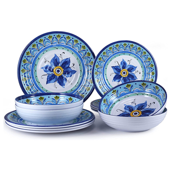 Geschirrspüler sicher BPA-frei blaues Blumen-Design 12-teiliges Teller und Schalen-Melamin-Geschirr-Set für 4 Camping-Geschirr